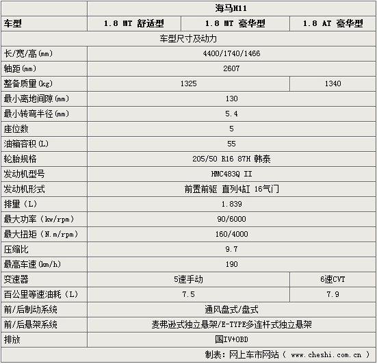 海马3两厢版系列车型车全长4400mm,相比三厢版系列车型并不逊色,宽度以及车身高度也控制的非常合理。最小离地间隙达到130mm,保证其具优良的道路通过性。在动力方面,全系车型搭载的是海马最新研发的第二代HA-VIS-1.8系列发动机(HMC483Q II),最大功率90/6000(kw/rpm),最大扭矩为160/4000(Nm/rpm),这样的数据应该说在同级别的发动机中是较注重动力的一款。