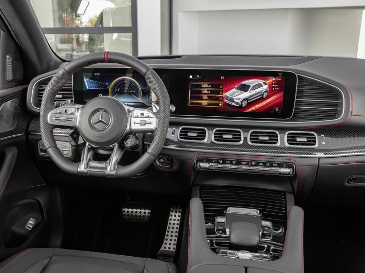 进到车内,可以发现该车是基于普通版车型所打造,但在细节处采用了大量的碳纤维材质,配合少量红色元素点缀,让新车内部呈现出一定的运动感。另外,AMG标志性的方向盘也是必不可少的,配合奔驰最新的MBUX车载多媒体系统,使得其操作更加便捷,实用性极强。