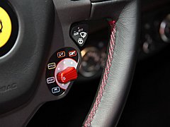 为了让法拉利公路汽车的性能不断接近F1赛车,原先安装在转向柱上的控制杆已经全部被淘汰,如今所有主要控制装置都集中在方向盘上,从而令驾驶员在任何时候都能最为充分有效地控制汽车,发动机启动控制键和驾驶模式选择依然在熟悉的位置上。