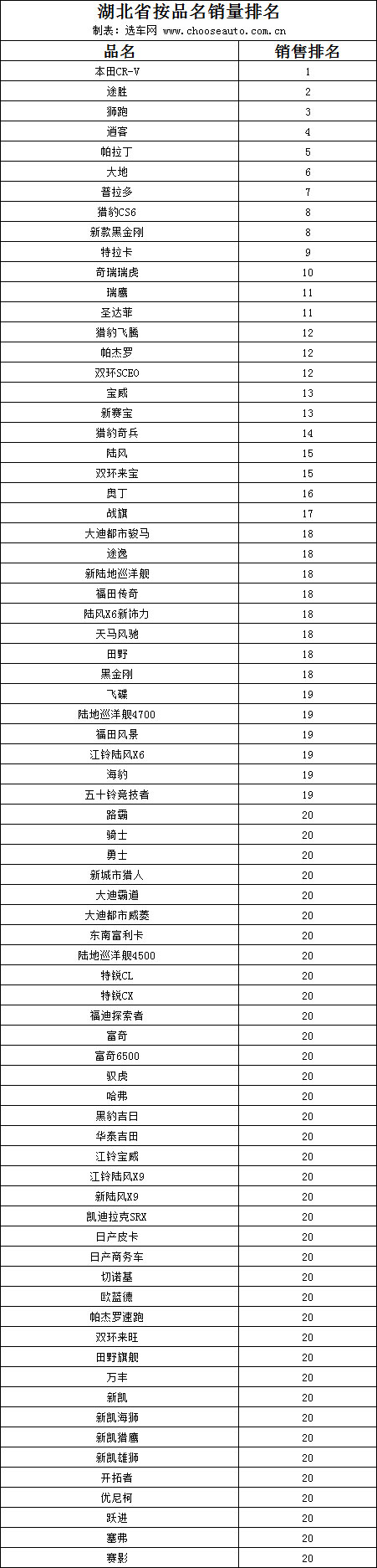 关键词:SUV,排名,湖北,销售量,品名