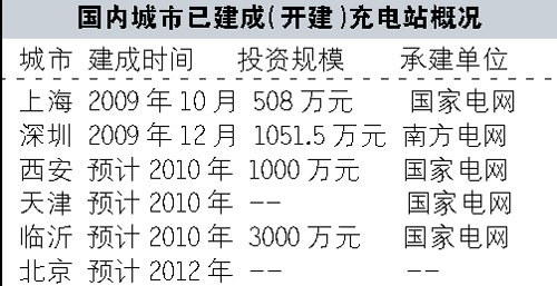 记者从国家电网公司官网了解到,目前国家电网已经在上海、天津和西安等城市展开电动车充电站建设试点。按照国家电网的计划,今年12月前将在全国27个城市开建电动车充电站。