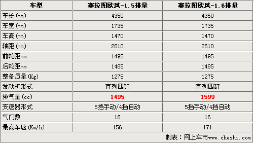 东风悦达起亚即将推出的1.5排量的赛拉图欧风在车身尺寸上和1.6排量的车型完全一样。只是发动机换成了1.5升的G4EC汽油发动机。变速器与 1.6车型一样,都是5挡手动变速器和4挡自动变速器。由于排量的降低,1.5排量的赛拉图欧风最高是时速值达到了156 Km/h,1.6排量的车型可以跑到171Km/h。