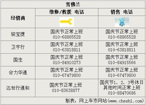 作为知名的美系品牌之一,福特在国内的销量近两年稳步提升,福克斯的热卖让品牌赢得了更多消费者的认可与肯定。“十一”长假期间,表中列出的5家4S店维修保养全部无休息日,销售方面除了亚之杰世纪1、2、3号休息以外,其他4家照常上班。
