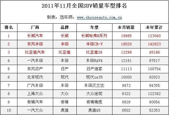 如果说哈弗H是本月SUV市场中的一个亮点,那么另外一个亮点就是比亚迪S6了。本月比亚迪S6销量名次上升至第三名,为12296辆,虽然成绩不错,但是由于比亚迪前三季度的全年销量完成率非常惨淡,仅为45.%,所以我们仍然不能排除比亚迪大肆向经销商压库的可能,所以对于比亚迪S6陡然升高的销量,我们需要持谨慎态度。
