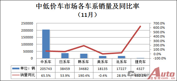 自中低价车市场开始进入自主品牌领跑区域,洋品牌在这一市场的销量比重基本维持在接近四成,形成自主品牌一枝独秀的局面。