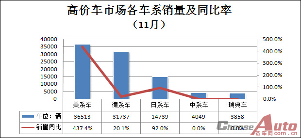 德系车仅有大众途观这一款车,销量同比、环比均有所增长,且单车销量超过日系车仍一款车型,但因“单兵作战”,因此排在第三位。